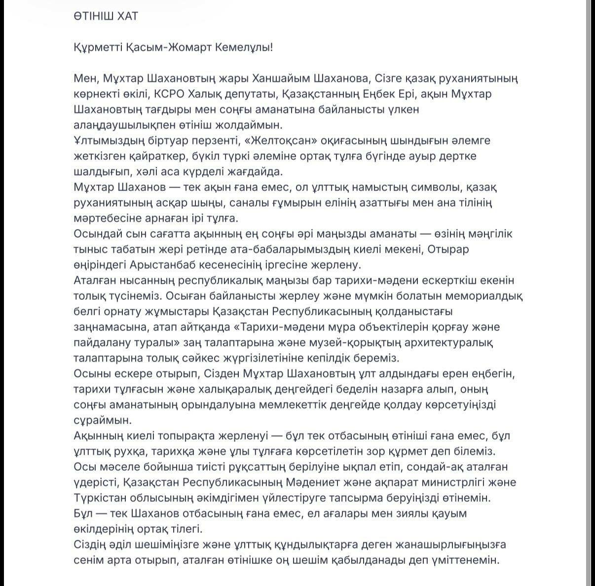 Ханшайым Шаханова бұл бастаманың тек отбасының ғана емес, ел ағалары мен зиялы қауым өкілдерінің ортақ тілегі екенін атап өтті. Одан бөлек, аталған нысанның республикалық маңызы бар тарихи-мәдени ескерткіш екенін толық түсінетінін айтып, жерлеу және мүмкін болатын мемориалдық белгі орнату жұмыстары Қазақстанның қолданыстағы заңнамасына толық сәйкес жүргізілетініне кепілдік беретінін жеткізді.